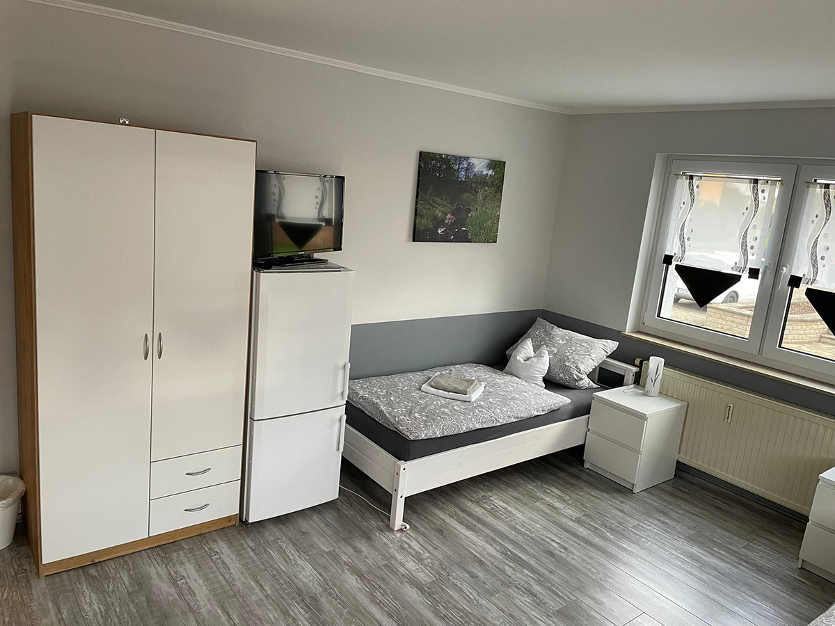 Unser 3-Bettzimmer-Monteurzimmer ist mit drei Einzelbetten ausgestattet. Euch steht pro Bett ein geräumiger Schrank zur Verfügung, in dem Ihr Eure Sachen sicher verstauen können.